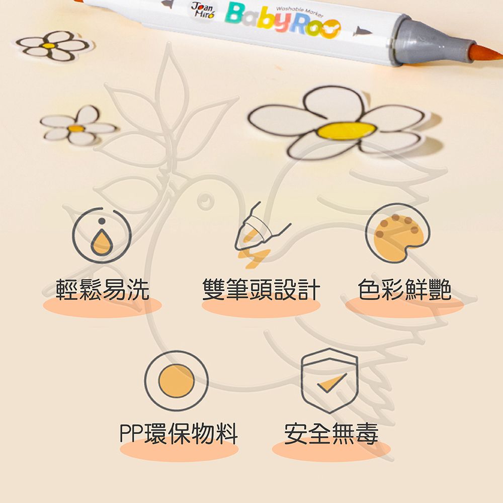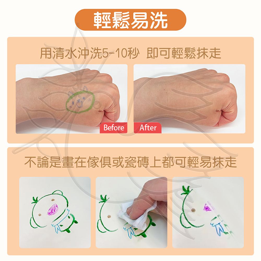 雙頭可水洗藝術馬克筆以無毒墨水製成;無麩質、異味。 不會刺激孩子嬌嫩的皮膚。 筆帽的孔能避免窒息風險。