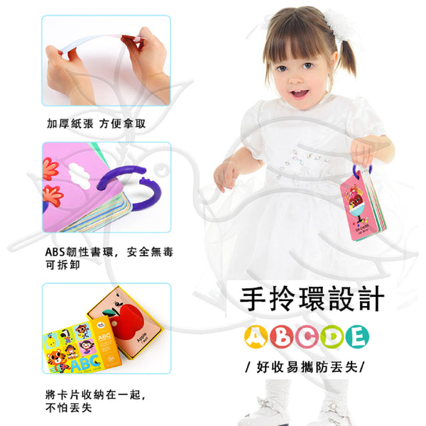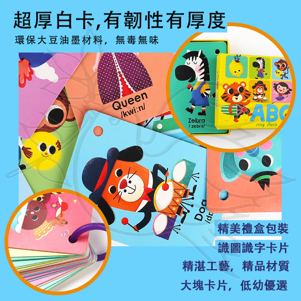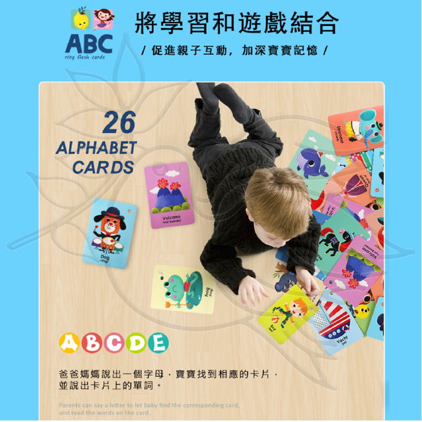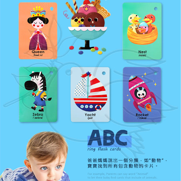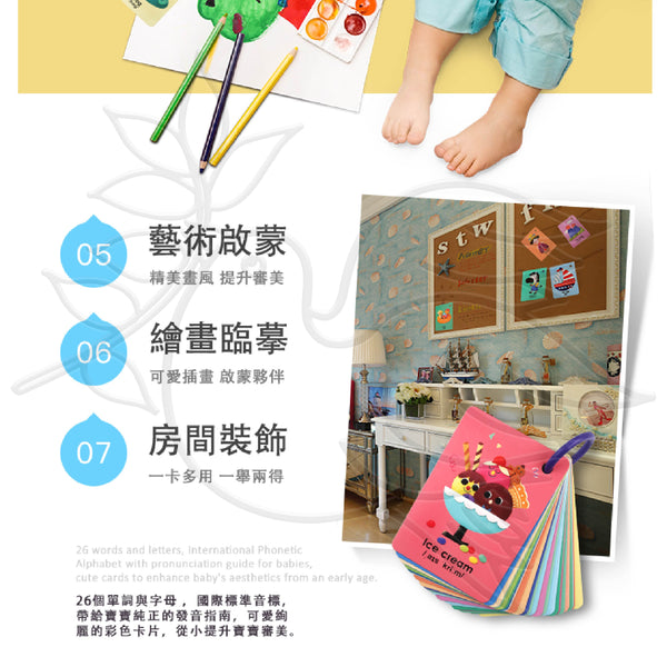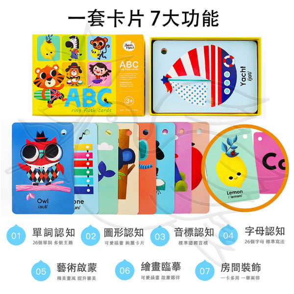 26個單詞與字母 ,國際標準音標,帶給寶寶純正的發音指南,可愛絢麗的彩色卡片,從小提升寶寶單詞、圖形、音標及字母認知。