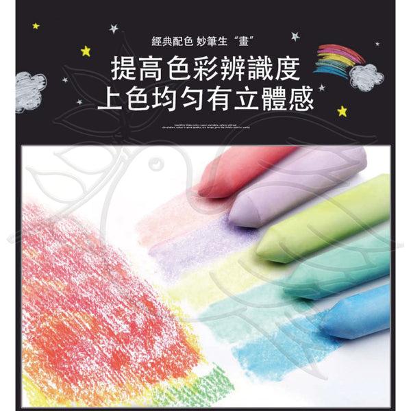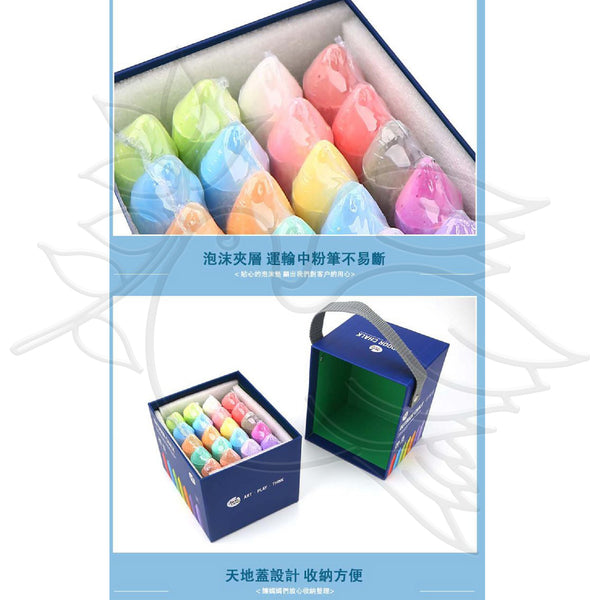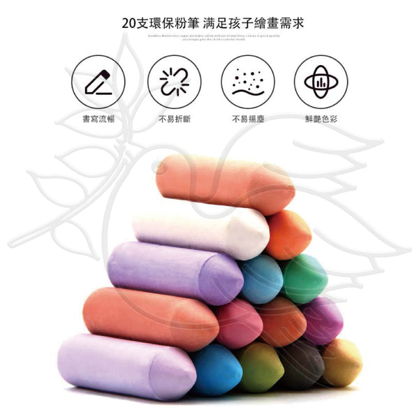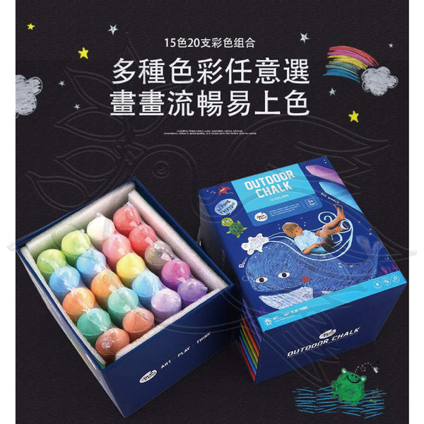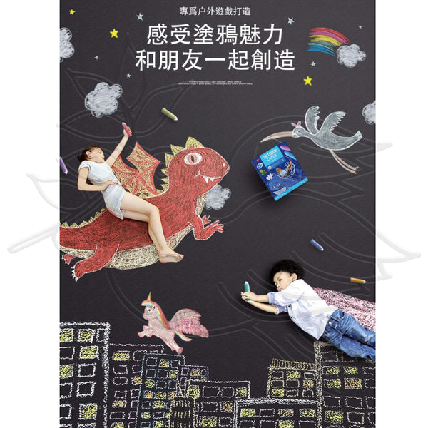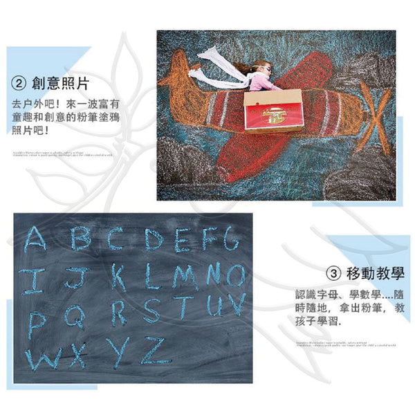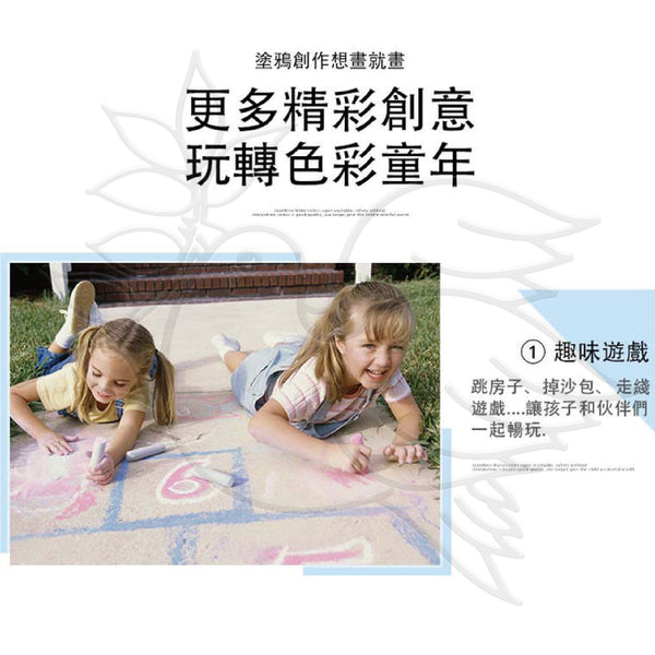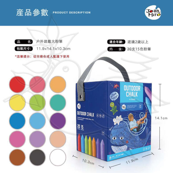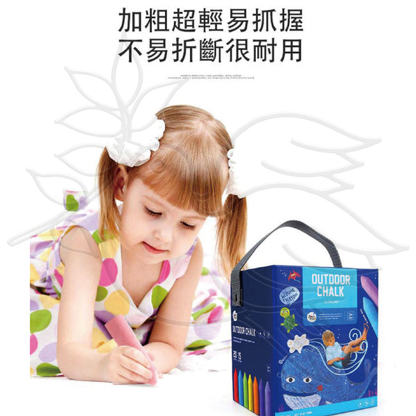 這套粉筆是用作戶外塗畫。孩子天性喜歡隨意繪畫,不要限制他們的創作!繽紛顏色的粉筆,是專為戶外繪畫之用,能為我們的小小畫家提供無限繪畫經驗!戶外粉筆是易於清洗,只需用水沖洗或抹去便可。