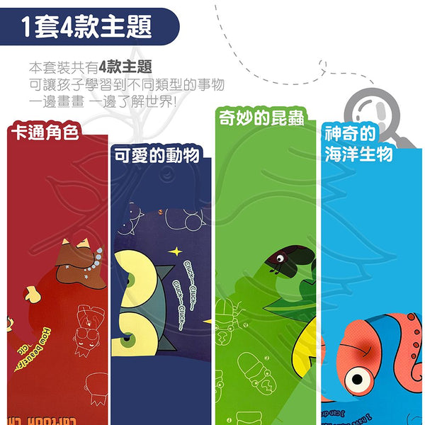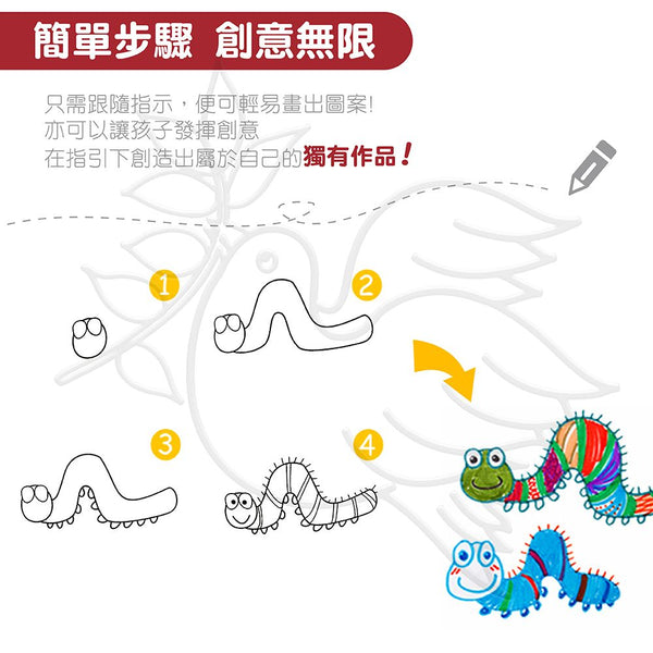 只需4步,孩子就能輕鬆完成畫作,能提高孩子對繪畫的興趣和增強自信心!套裝包括了四個可愛主題:海洋生物、人物、動物和昆蟲。