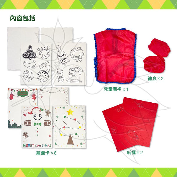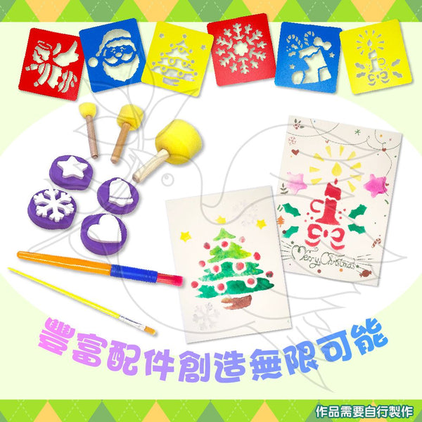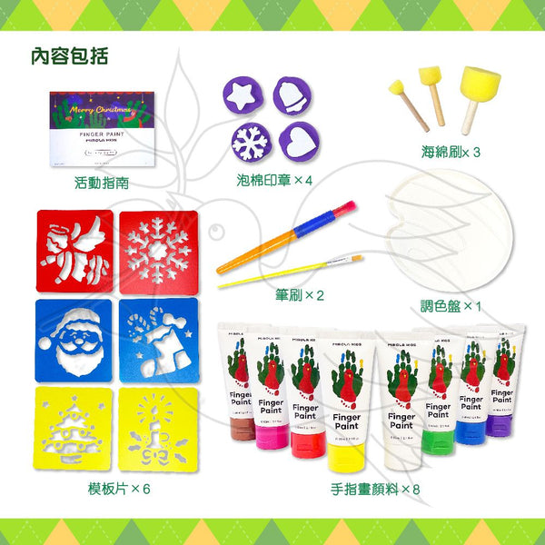 裝內配備一支珍珠色(銀色)顏料,我們可將珍珠色混合與其他色彩的顏料中,使其有金屬的珍珠效果。盒內附有各種聖誕節的圖樣模板,我們利用手掌及手指配合套裝內的各種卡片進行創作,並且寫上聖誕的祝福語,送給我們最敬愛的親朋。這是獨一無二的禮物,給他們帶來無限驚喜!聖誕快樂!