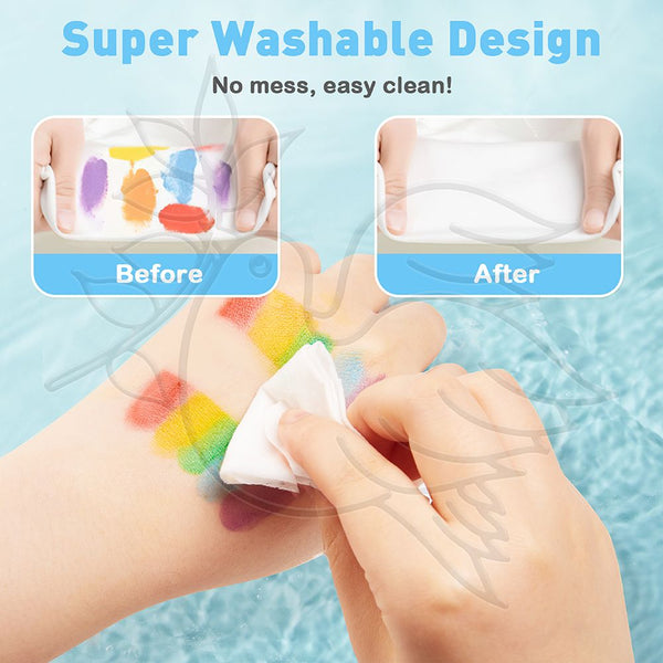 運用可水洗顏料,只需利用濕紙巾或濕布輕輕一拭便能把兒童手指上的顏料抹去。