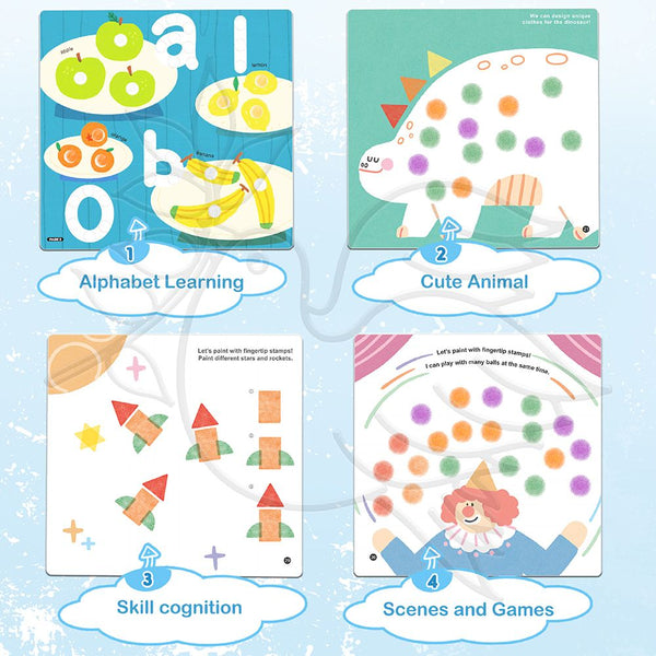 活動冊包含各種主題:動物、字母、天氣、水果等。兒童一邊遊玩,一邊學習不同場景知識,深化理解。使用幾何圖形印章配合主題場景,可提供兒童幾何的初步概念。